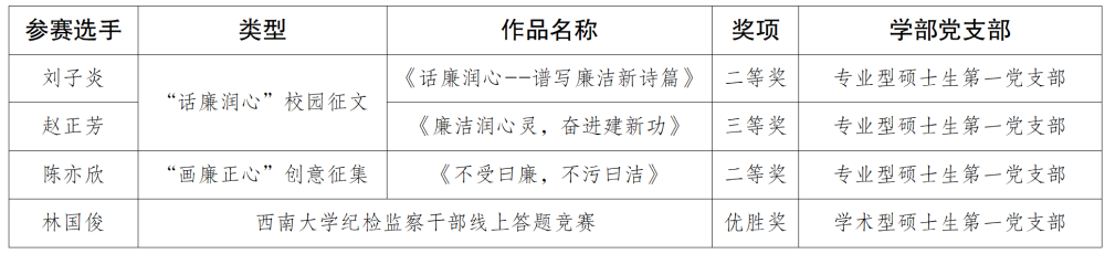 为深入学习贯彻习近平新时代中国特色社会主义思想和党的二十大精神,推动党纪学习教育走深走实,进一步夯实清正廉洁思想根基、厚植廉洁奉公文化基础、培养廉洁自律道德操守、弘扬崇廉拒腐社会风尚,根据党中央《关于加强新时代廉洁文化建设的意见》精神和《教育部办公厅关于举办第九届高校廉洁教育系列活动的通知》要求,学校在全校范围开展廉洁教育系列活动。活动开展以来,学部纪委高度重视,积极发动、精心组织各党支部开展廉洁教育主题活动。经专家评审,学部学子荣获“话廉润心”校园征文类二等奖一项、三等奖一项,“画廉正心”创意征集类二等奖一项,西南大学纪检监察干部线上答题竞赛优胜奖一项。