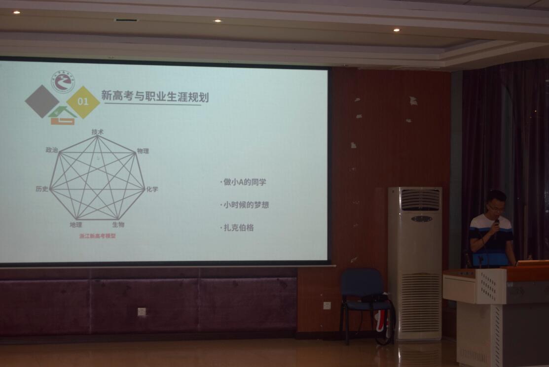 随后, 从“如何培养中学生职业意识”这一主题为切入点,郑周义老师做出了报告,并实际结合了“新高考”政策的具体相关内容;阐述了“职业兴趣的测评与能力培养”相关内容,从专业角度简单介绍了“霍兰德职业兴趣”、“迈尔斯布里格斯类型指标”,并从学生实际情况出发说明了能力和个人价值观对职业生涯规划的影响;郑周义老师也提到了“如何赢得自主招生”这一问题,在介绍了国内高校自主招生相关要求和情况后,给出了几点实际对策:一、自主招生是进入高校不错的途径,但学生应认识到不是所有人都适合走这条道路。二、想参加自主招生的学生应当早早准备,确定自己的方向、符合的条件,并为之针对性的努力。三、自主招生近几年的改革催生了一系列周边机构,学生应当谨慎与机构合作,并最好自己独立完成专利、学术论文等;就“科学填报高考志愿”这一老生常谈的问题,郑周义老师从专业的角度给出了独特见解。