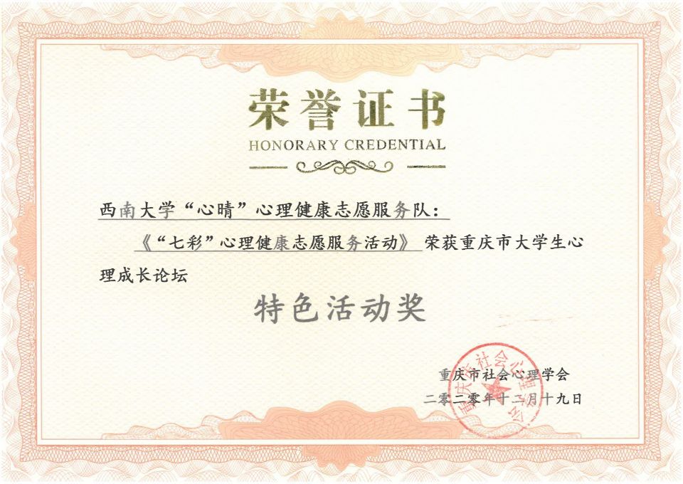 王慧祯、唐佳钰、吕慧心理成长微作品《疫情“着陆”》荣获心理成长微作品二等奖;张茜玲、杨雨萌、杨丽萍、刘宇宇《“疫”路同心———心理战“疫”故事会》(指导老师:叶海燕、王华敏)荣获心理健康服务一等奖;《调整情绪,携手抗疫》(指导教师:陈富国)荣获心理服务优秀成果一等奖;《西南大学心晴心理健康服务队服务方案》(指导教师:李欣)荣获心理服务优秀成果二等奖;欧柳彤、刘可杨、程竞暄、梁思齐、邹巧雯、李妍《科学应对疫情——打败焦虑小怪兽》(指导教师:高雪梅)荣获心理成长微课比赛一等奖;张芸嘉、廖龙越、杨妍《构筑心理的防护墙,认识替代性创伤》(指导教师:陈富国)荣获心理成长微课比赛一等奖;张云薏、杨雨霏、刘雨欣、郭一冰《感悟人生价值,绽放生命精彩》荣获心理成长微课比赛二等奖;王君翊、周艺博《对疫情心理危机Say No》(指导教师:丁书扬)荣获心理成长微课比赛三等奖。在心理之家建设成果评选活动中,西南大学365上市公司(英国)集团荣获校级、院级心理之家一等奖(指导教师:陈伟海);李园三舍231荣获宿舍心理之家二等奖。