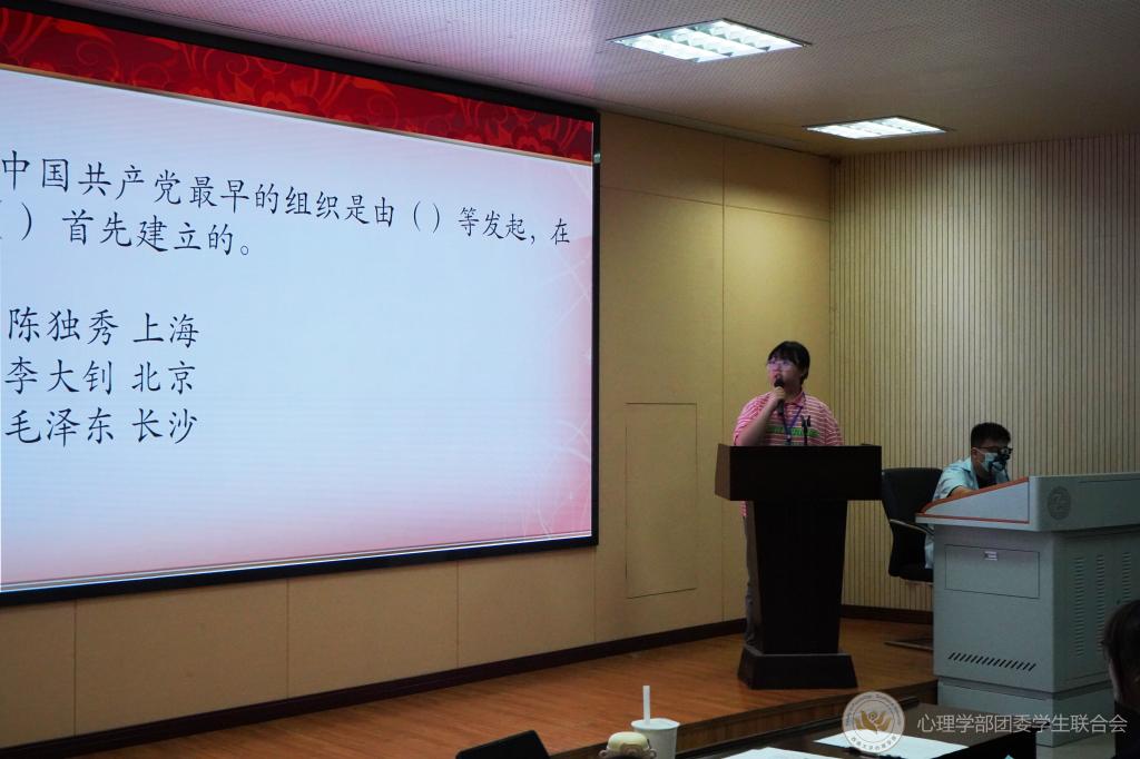 接下来是共青团基础知识测试与现场竞答。每个支部选3名团员以小组形式参与答题,选手回答显示在屏幕上的题目,每道题限时30S,答案记录在发下的答题卡上,最后由相关人员收集并计算总分。