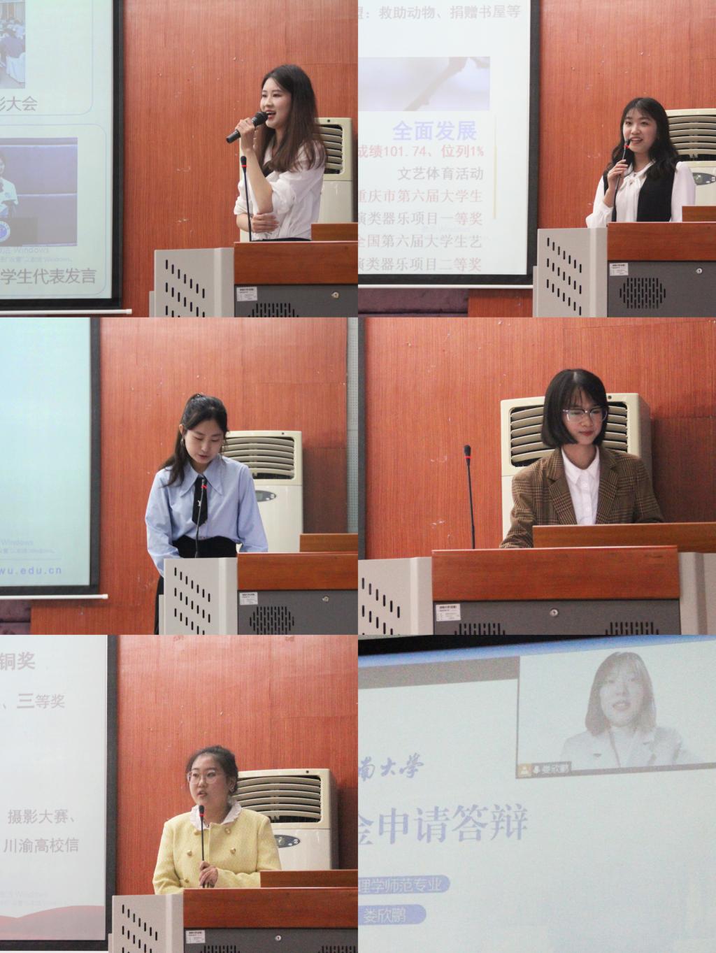 参加答辩的同学从学习情况、社会实践、科技创新、社会工作等方面对自己过去一年的经历进行了阐述。他们用自己的学习和实践经历,生动展示了各自精彩纷呈的大学生活,充分体现了心理学子扎实的专业基础和优秀的综合素质,有力诠释了“德、智、体、美、劳”全面发展的重要意义。台下各位评委仔细倾听,认真记录,频频点头。本科新生们也都洗耳恭听,接连赞叹,并在每位国奖答辩者的精彩发言结束之后报以热烈掌声!