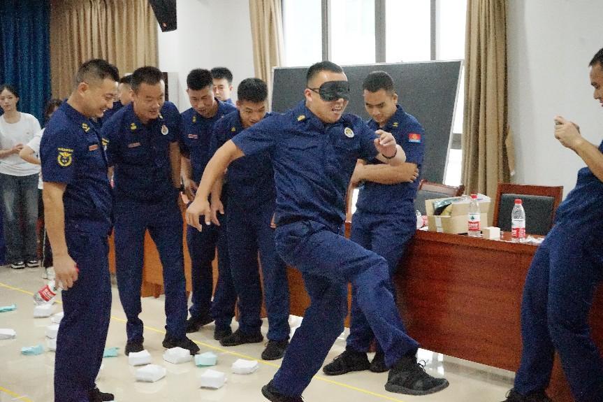 讲座结束后,团队成员们组织了一场紧张刺激的"踩地雷"游戏。消防员们被分为排雷员和指挥员。排雷员依据指挥员的指示行动,尽可能多的踩到蓝色盒子,尽可能少的踩到白色盒子。最终,裁判通过积分的方式平定胜负。消防员们通过团队合作和策略规划,成功地"排除"了一个个"地雷"。在游戏环节中,现场气氛高涨。这一环节不仅锻炼了他们的团队协作能力,更让他们在紧张刺激的氛围中体验到了压力的释放。