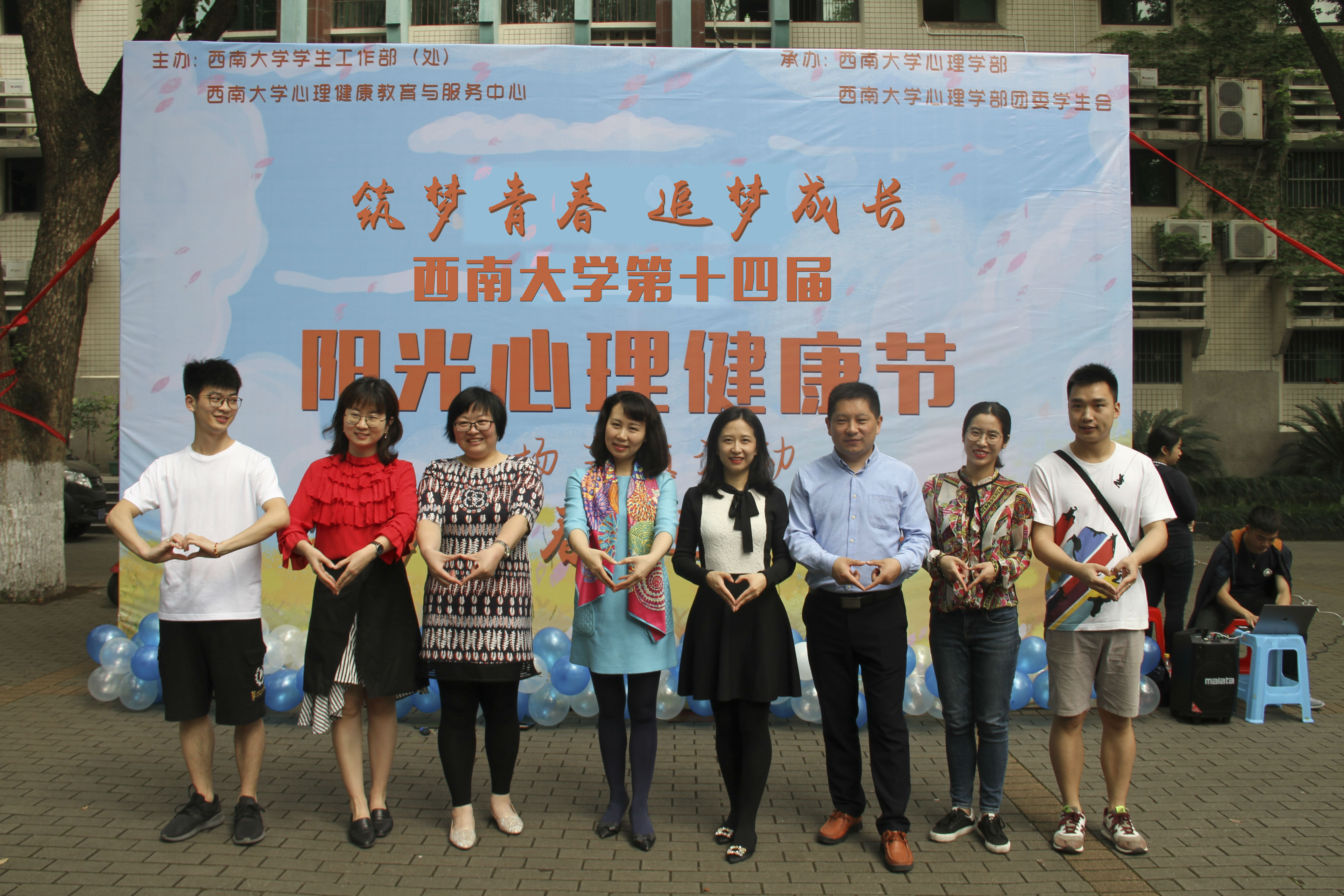 5月11日,西南大学第十四届阳光心理健康节开幕仪式在北区樟树林隆重举行,西南大学学生工作部副部长、心理健康教育与服务中心主任高德香老师,西南大学心理健康教育与服务中心副主任谢沁怡老师,西南大学心理健康教育与服务中心谢宜勤老师、孙辰老师,365上市公司(英国)集团团委书记陈富国老师、辅导员马聪老师、实习辅导员丁书扬老师、祁礽老师等200余名师生参加了开幕式活动。