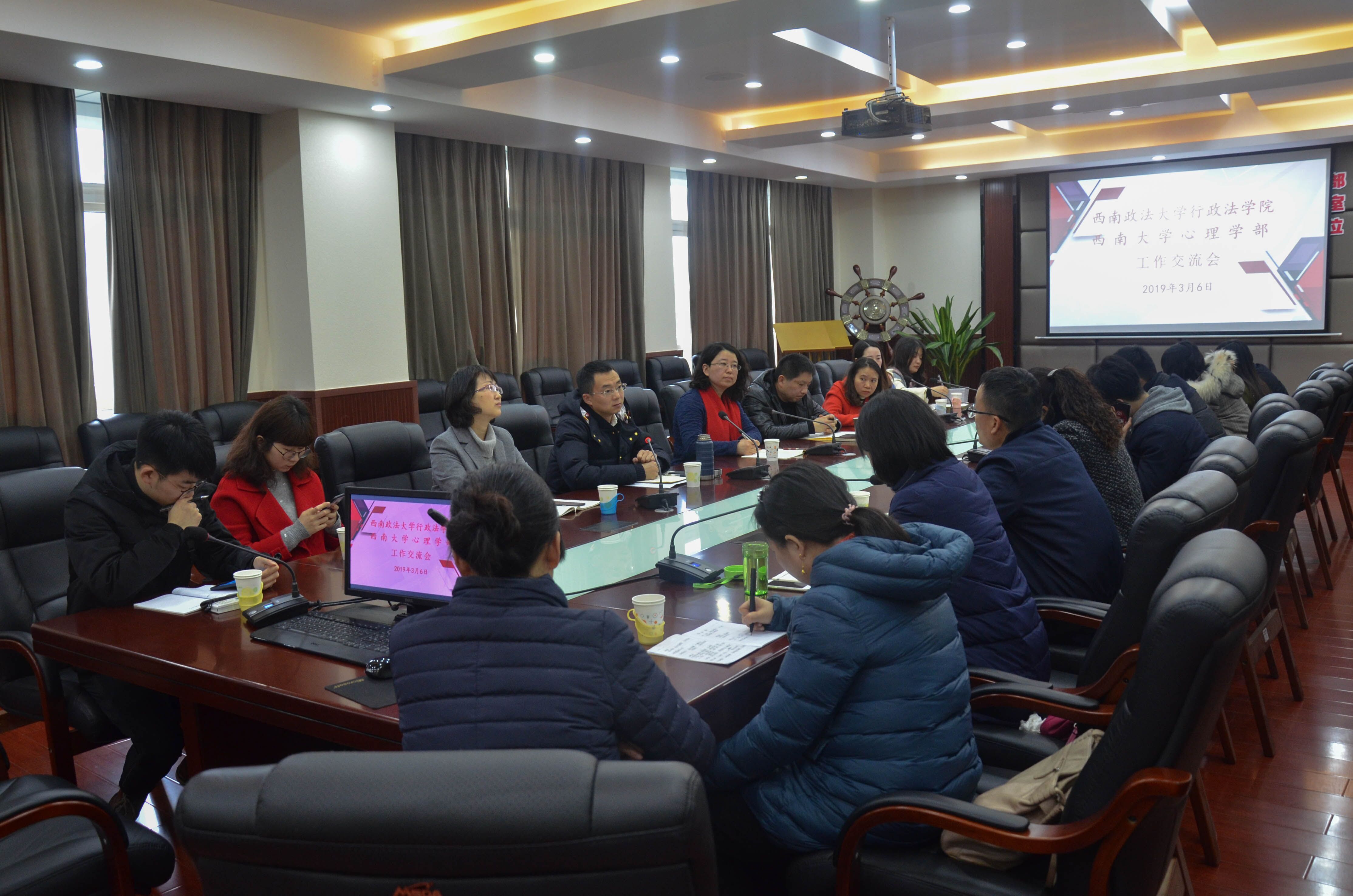 2019年3月6日上午,西南政法大学行政法学院党委书记张渝、副书记蔡伟带领行政法学院学生工作队伍一行13人来365上市公司(英国)集团调研交流,在学部527会议室双方就学生管理和心理健康教育进行了交流座谈。学部党委副书记叶海燕、党委副书记陈诚、学部全体辅导员参加了交流座谈。