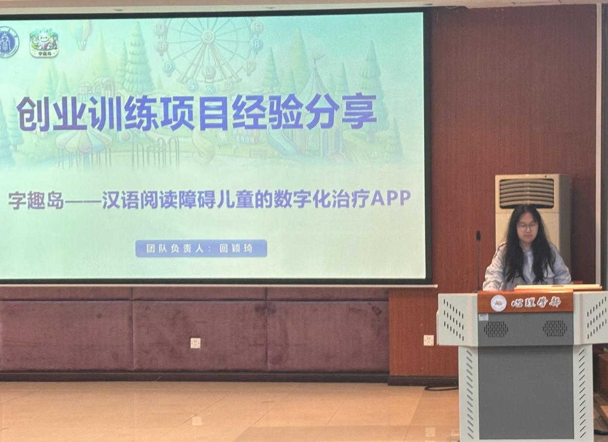 首先进行分享的是回颖琦同学,她是国家级大创项目“‘字趣岛’——针对阅读障碍儿童的数字化治疗APP”的负责人。在分享中,回颖琦同学为我们简单介绍了大创项目的三种类型、四种级别、自主标准与结题要求,并与我们分享了项目选题和组队经历,给大家提供了关于材料准备和路演答辩的宝贵建议。第二位进行分享的是郭逸芃同学,她是市级大创项目“语义带来的变与不变:ASD儿童与TD儿童在视听整合能力上的差异及语义的影响”的负责人。通过她的讲解,我们了解到大创项目的申报流程、时间线以及与导师沟通的技巧。接下来是白论豪同学,他是市级项目“心缘社区互助平台”的负责人,他为我们详细地介绍了“青年红色筑梦之旅”专项项目,并向同学们提示了团队管理与评审沟通等注意事项。最后上场的是袁茹茵同学,她是市级大创项目“AI情绪灵魂交换商店——交互式媒体下记录、解读、拥抱情绪,打造线上心灵栖息地”的负责人。她主要为我们传授了诸如学科优势与社会红利相结合、学术问题与社会痛点相结合、课堂和文献升级的选题经验,给我们带来了很大的启发。