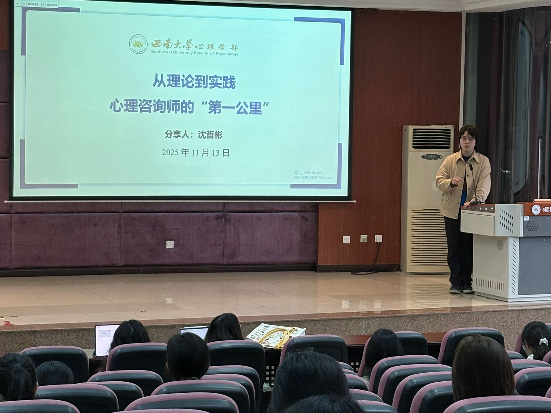 这条融汇了“自我,学习,运用,实践”的成长路径,为在场未来所有同学指明了前行的方向。对于心理学子而言,这次讲座不仅是一场知识的传授,更是一次从课堂理论迈向临床实践的生动指引。讲座虽已结束,但属于每位同学的专业修行才刚刚开始。沈哲彬同学以其扎实的专业知识与丰厚的实战经验,在每一位同学心中点亮了一盏明灯。带着这份希望,参与讲座的心理学子将以更充分的准备和更深刻的自觉,经历关乎技术精进,更关乎人格成熟与生命智慧的漫长修行,迈向助人工作的广阔天地。