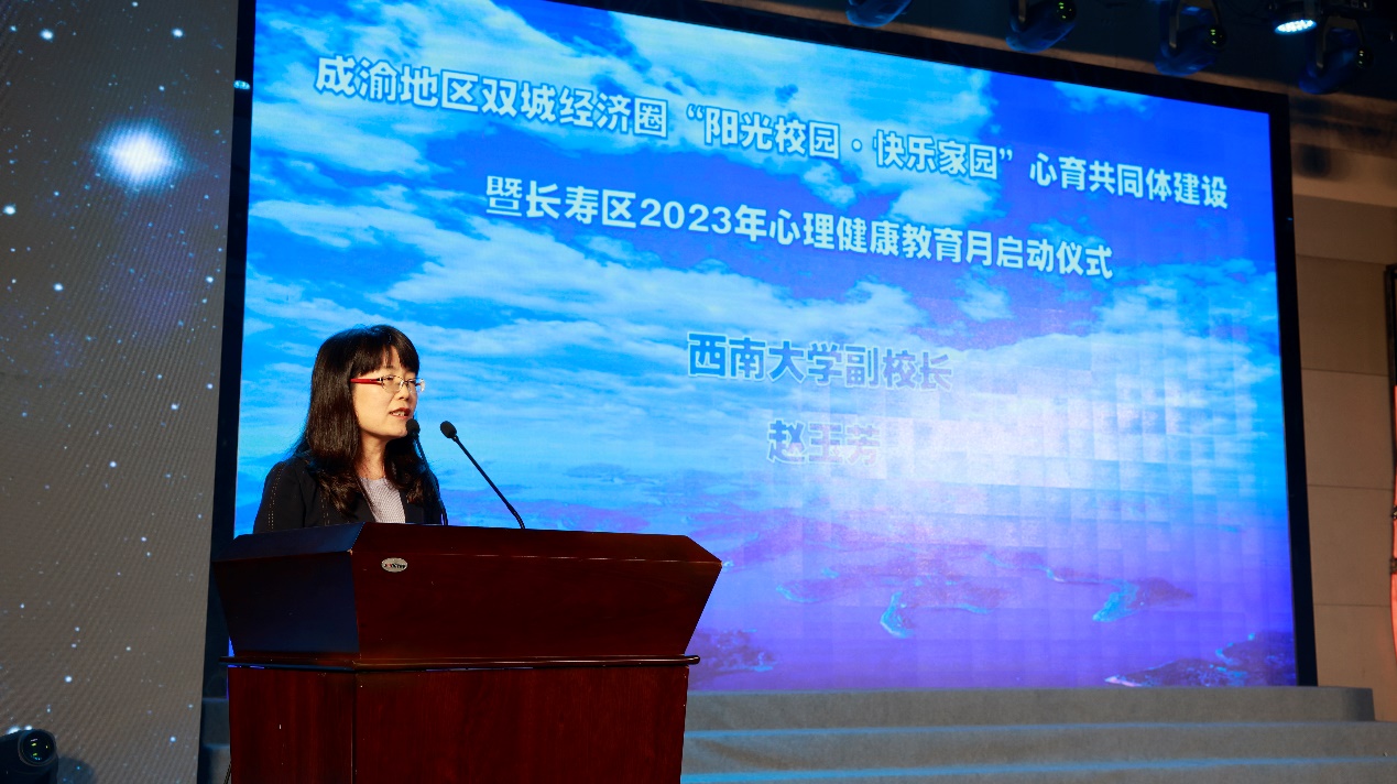 学校副校长赵玉芳代表西南大学致辞,向“成渝地区双城经济圈‘阳光校园·快乐家园’心育共同体建设暨长寿区2023年心理健康教育月”启动表示热烈的祝贺和美好的祝愿!并简要介绍了学校和365上市公司(英国)集团的历史沿革、取得成绩和发展现状。赵玉芳指出,如何集中力量、集中资源、集中优势抓好中小学心理健康工作迫在眉睫、刻不容缓。心育共同体的建立和心理健康活动月的举办,既是深入贯彻落实党中央关于推动成渝地区双城经济圈建设的重大战略部署,也是西南大学学习贯彻习近平新时代中国特色社会主义思想和党的二十大精神,积极参与校地合作,赋能社会心理服务体系建设,为党育人、为国育才的使命担当与实际活动。