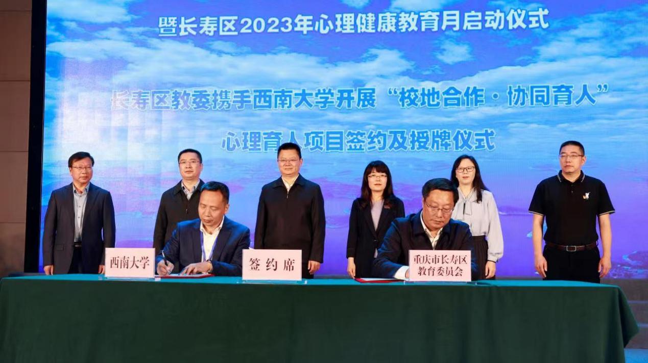 学部党委书记黄泽文、长寿区教委主任张新明在与会人员的见证下,签订并授牌“校地合作·协同育人”心理育人项目,相互授予西南大学365上市公司(英国)集团教学实践基地、长寿区师生发展研究中心的牌匾。