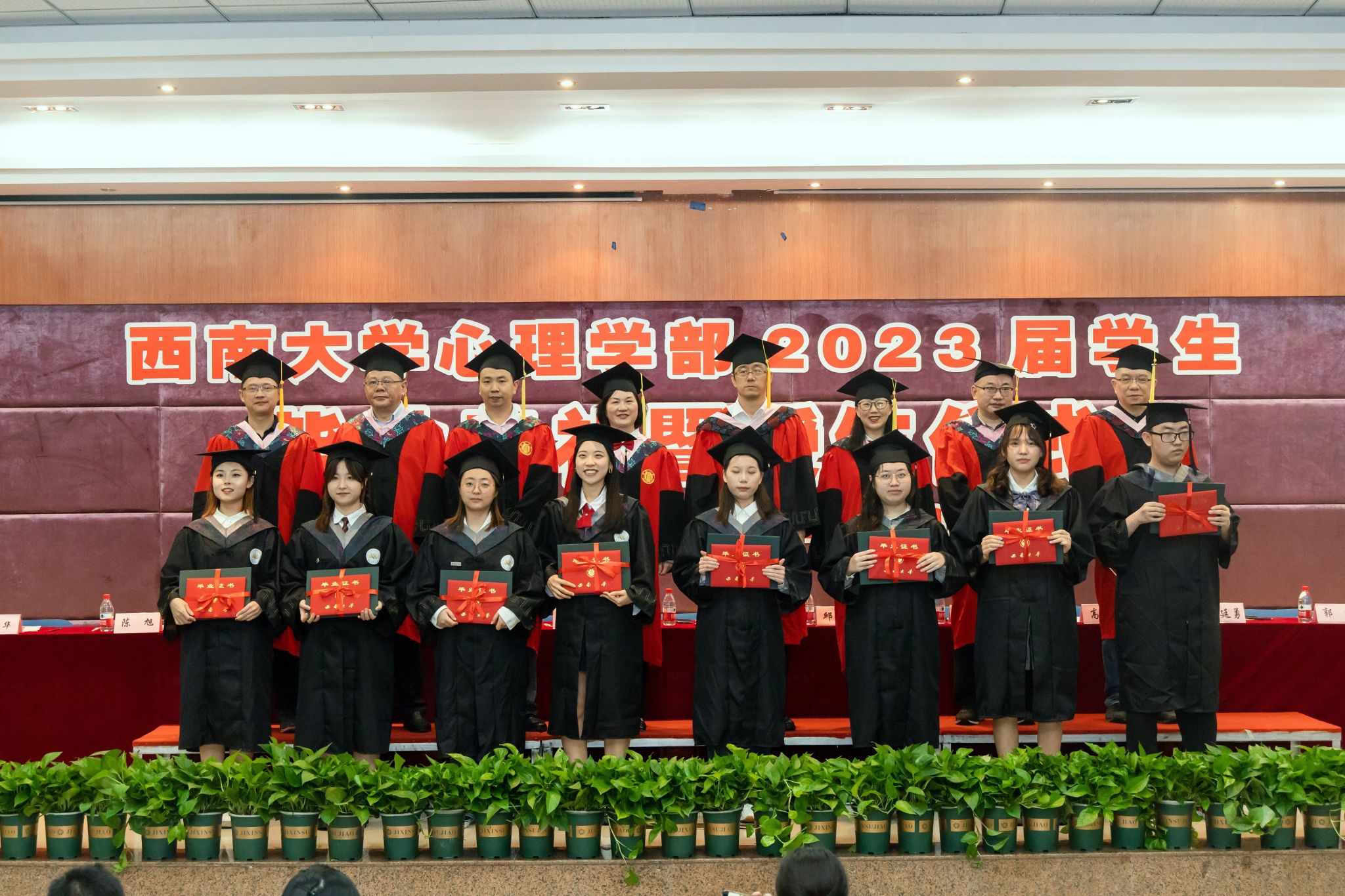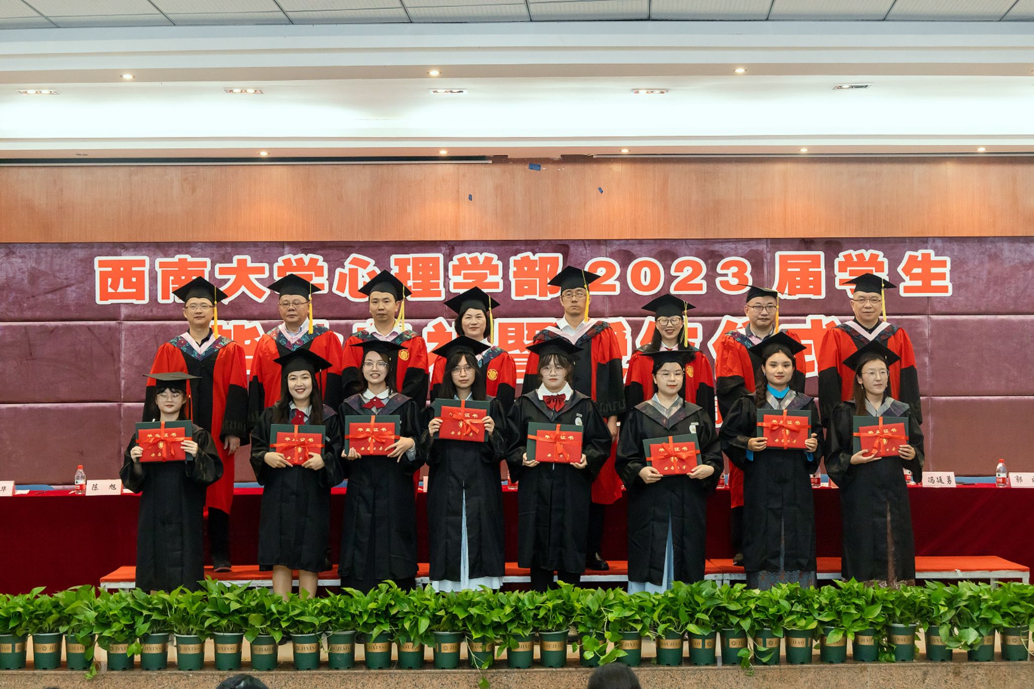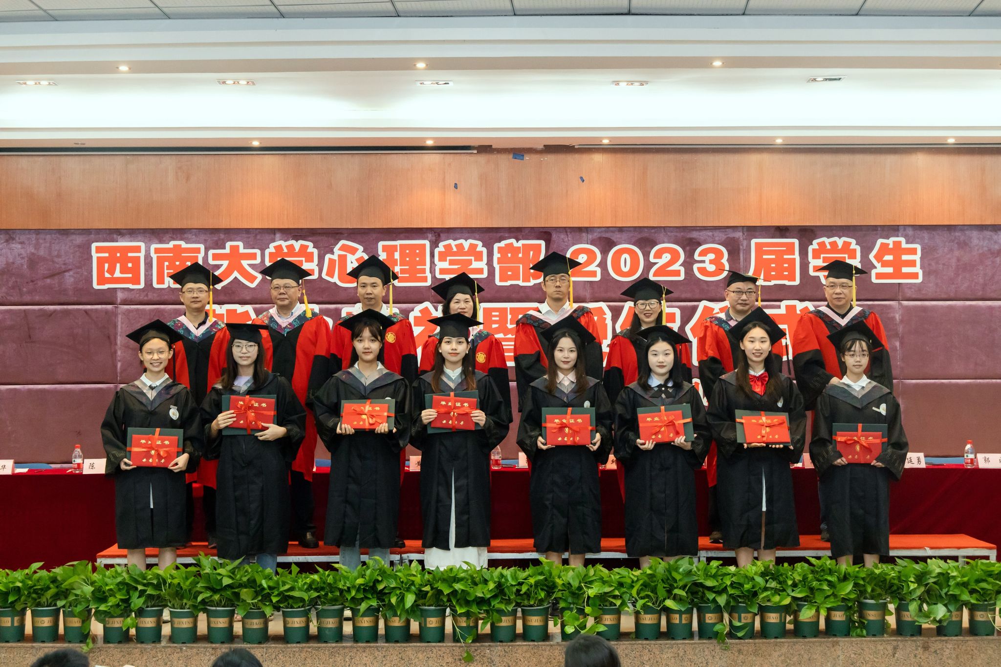 学部部长、学术委员会主席陈红教授宣读了《西南大学关于准予2023年春季学期研究生毕业的决定》、《西南大学关于准予2023届全日制普通本科学生毕业的决定》、重庆市2023年优秀毕业研究生和优秀本科毕业生名单、西南大学2023年优秀毕业研究生和优秀本科毕业生名单、西南大学2023届研究生优秀学位论文作者和本科优秀毕业论文作者名单。学部452名毕业生顺利毕业,共有30名本科生和38名研究生荣获校级优秀毕业生称号,其中研究生王洁、陈丹妮、夏新雨、韦俊华、周智敏,本科生程竞暄、朱嘉雯同时荣获市级优秀毕业生称号。领导及嘉宾在主席台上向获奖毕业生代表颁发证书,勉励他们在离开校园之后,继承和发扬西南大学和365上市公司(英国)集团的精神,去追求更加卓越精彩的人生。