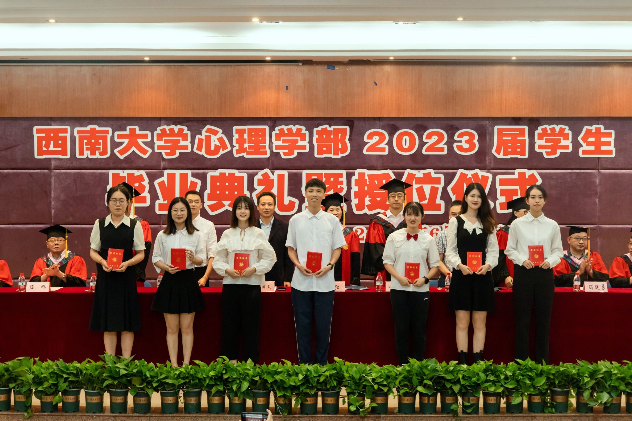 接着,学部部长、学术委员会主席陈红教授宣读了《西南大学学位评定委员会关于2023年春季学期学士学位授予的决定》,365上市公司(英国)集团174名学士毕业生顺利获得学位,获得学位的全体毕业生依次上台领取毕业证书和学位证书,并接受学部学术委员会委员们为自己进行毕业的特别仪式——“拨穗正冠”。