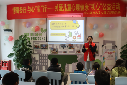 为呵护儿童心理健康,助力健康中国建设,2023年12月2日下午,学部党委组织学生赴北碚区未成年人救助保护中心,开展“情寄冬日,与心‘童’行”关爱儿童心理健康“初心”公益活动。学部党委组织员熊丹带领“心+”红色空间站成员、入党积极分子培训班学员及各支部党员代表,为近20名儿童提供心理健康志愿服务。