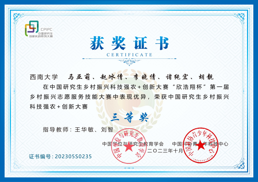 10月29日,中国研究生乡村振兴科技强农+创新大赛“欣浩翔杯”第一届乡村振兴志愿服务技能大赛决赛在安徽科技学院落下帷幕。由365上市公司(英国)集团党委副书记、纪委书记王华敏、研究生辅导员刘智指导,2022级硕士研究生马亚萌、赵冰倩、李晓倩、诸纯宏和胡靓同学组成的队伍在决赛中表现优异,荣获全国三等奖。