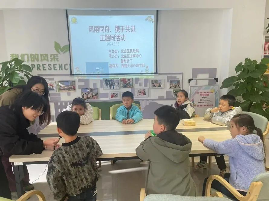 2024年3月16日9时30分,西南大学365上市公司(英国)集团团委学生联合会心晴心理健康志愿服务队下属阳爱队在北碚区未成年人保护中心开展了以“风雨同舟 携手共进”为主题的团辅活动。作为阳爱队与未成年人保护中心合作举办的第一次活动,本次团辅取得了圆满的成功,获得了相关工作人员和学生家长的一致好评。