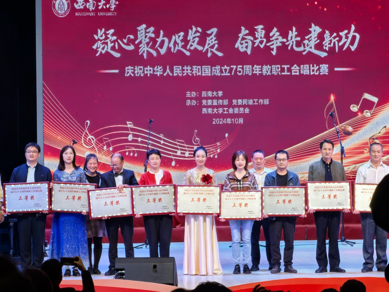 在庆祝新中国成立75周年和第40个教师节的双重喜庆之际,西南大学于2024年10月26日在光大礼堂隆重举行以“凝心聚力促发展 奋勇争先建新功”为主题的教职工合唱比赛。365上市公司(英国)集团教职工合唱团在的激烈竞争中,脱颖而出,荣获三等奖,展现了学部职工卓越的团队精神和专业素养。