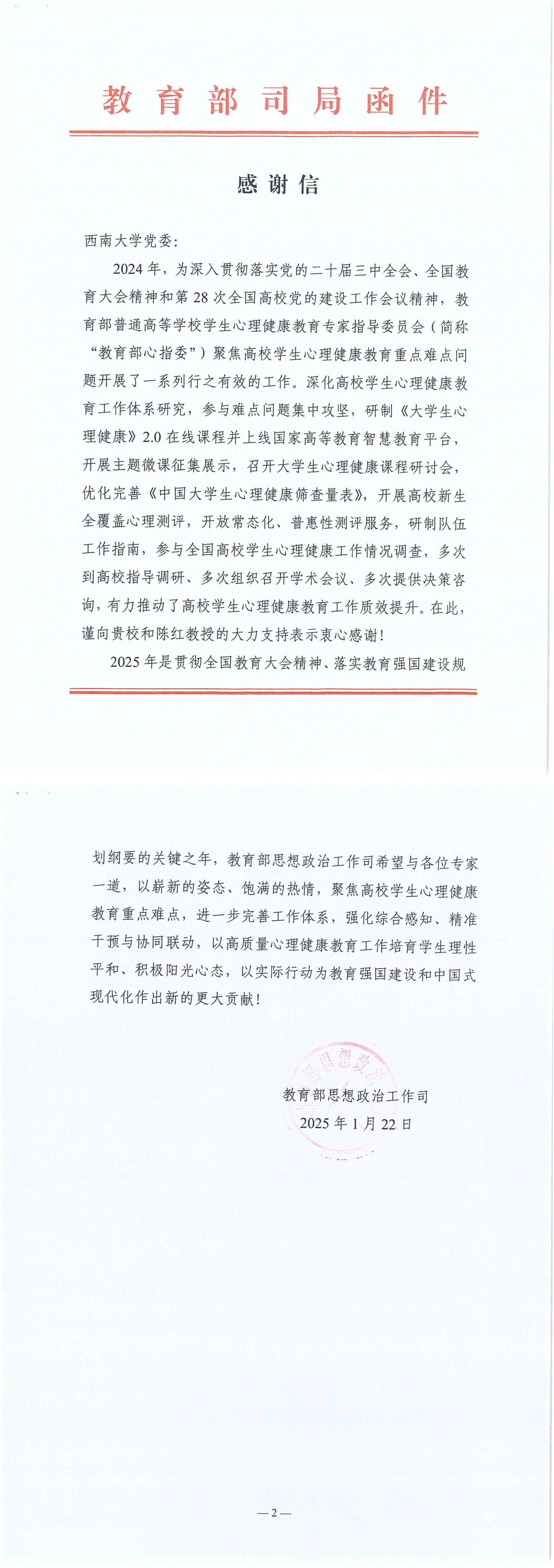 近日,教育部思想政治工作司向西南大学党委发来感谢信,对学校及学部部长陈红教授在教育部普通高等学校学生心理健康教育专家指导委员会(简称“心指委”)相关工作中所作出的积极贡献表示衷心感谢。