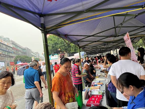一起参加本次宣传活动的还有区教委、区民政局、区司法局、区卫生健康委、团区委、区妇联、广电北碚分公司、北温泉街道、财保北碚支公司、重庆市北碚爱尔眼科医院、格兰云天康复保健职业培训学校。大家布置了各种各样的摊点,有给残疾人朋友做艾灸刮痧的、颈椎按摩的,有帮助残疾人朋友量血压、测视力的,有科普健康的小摊,也有给大家发放帆布袋、雨伞等日常生活用具的小摊,活动现场十分热闹。