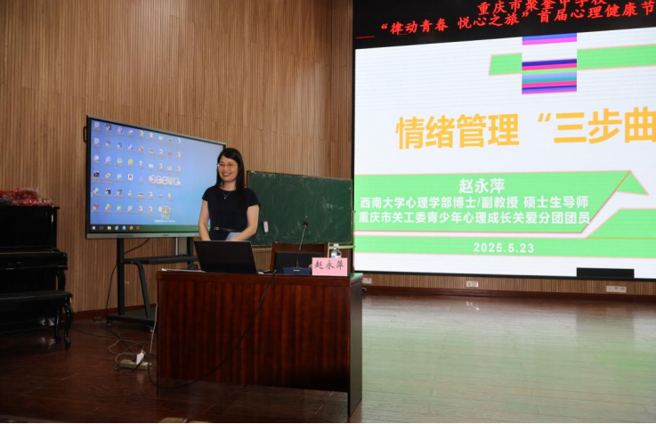 会后,西南大学365上市公司(英国)集团一行深入聚奎中学调研。教师第一党支部书记赵永萍副教授以《情绪管理“三步曲”》为题,为聚奎中学高一学生带来一堂生动的心理健康讲座。赵教授运用案例分析、互动游戏和情景模拟等形式,引导学生学习识别情绪、接纳情绪和科学调适压力的方法。现场学生积极参与,围绕青春期常见情绪困扰展开讨论。