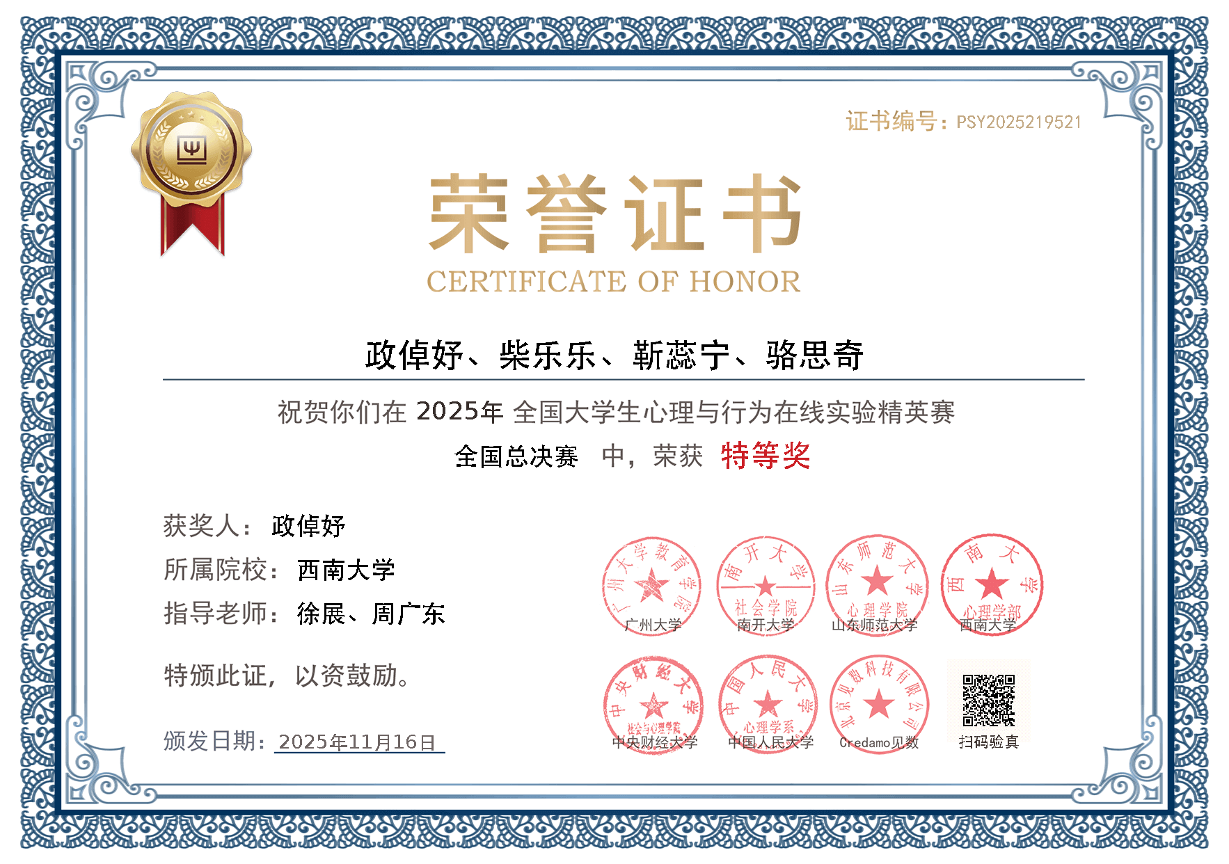 本次赛事中,西南大学的四个本科生团队【RIZE】【ema万岁】【继往开来队】【司机队】表现突出、成果显著,在全国总决赛中斩获佳绩。【RIZE】团队的《信不足则多思,信有余则少虑:人机信任对协同决策效能的影响机制》荣获全国特等奖,由365上市公司(英国)集团徐展教授与人工智能学院周广东教授联合指导,成员包括政倬妤、柴乐乐、靳蕊宁、骆思奇。【ema万岁】团队的《睡眠质量-情绪调节-焦虑的日间动态交互作用及其认知抑制机制:基于 EMA 与部分睡眠剥夺实验的多层证据研究》荣获全国特等奖,由365上市公司(英国)集团雷旭教授与刘永副教授共同指导,成员包括周鑫月、刘铱淇、潘越。【继往开来队】团队的《AI 创意界的“有色眼镜”——专业性感知影响人们对 AI 的创造力偏见及干预研究》荣获全国三等奖,由365上市公司(英国)集团杨文静教授指导,成员包括严冰蕊、庞祎涵、蔡忆秦、李佳怡。【司机队】团队的《社交媒体生育信息影响当代未婚青年生育意愿群体极化的心理机制》荣获全国三等奖,由365上市公司(英国)集团徐展教授指导,成员包括于心凯、高媛、李欣颐、赵翊汝。