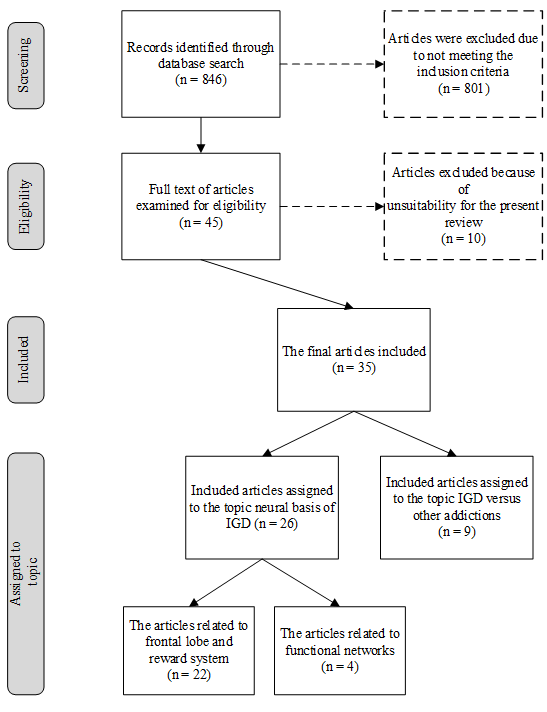 网络游戏成瘾(IGD)是一个待解决的行为成瘾问题,其在儿童和青少年中尤为严重,许多研究表明IGD患者会表现出高冲动特质,且IGD患者与健康对照组在涉及冲动和决策的大脑区域也存在有各种各样的差异,这些都表明了IGD患者存在冲动控制回路的缺陷。但以前的研究缺少对IGD患者的冲动控制回路进行一个全面的综述,该研究便筛选了从2014年后发表的关于IGD与冲动的文章(图1),对IGD患者产生冲动的神经基础进行了全面完整的综述。
