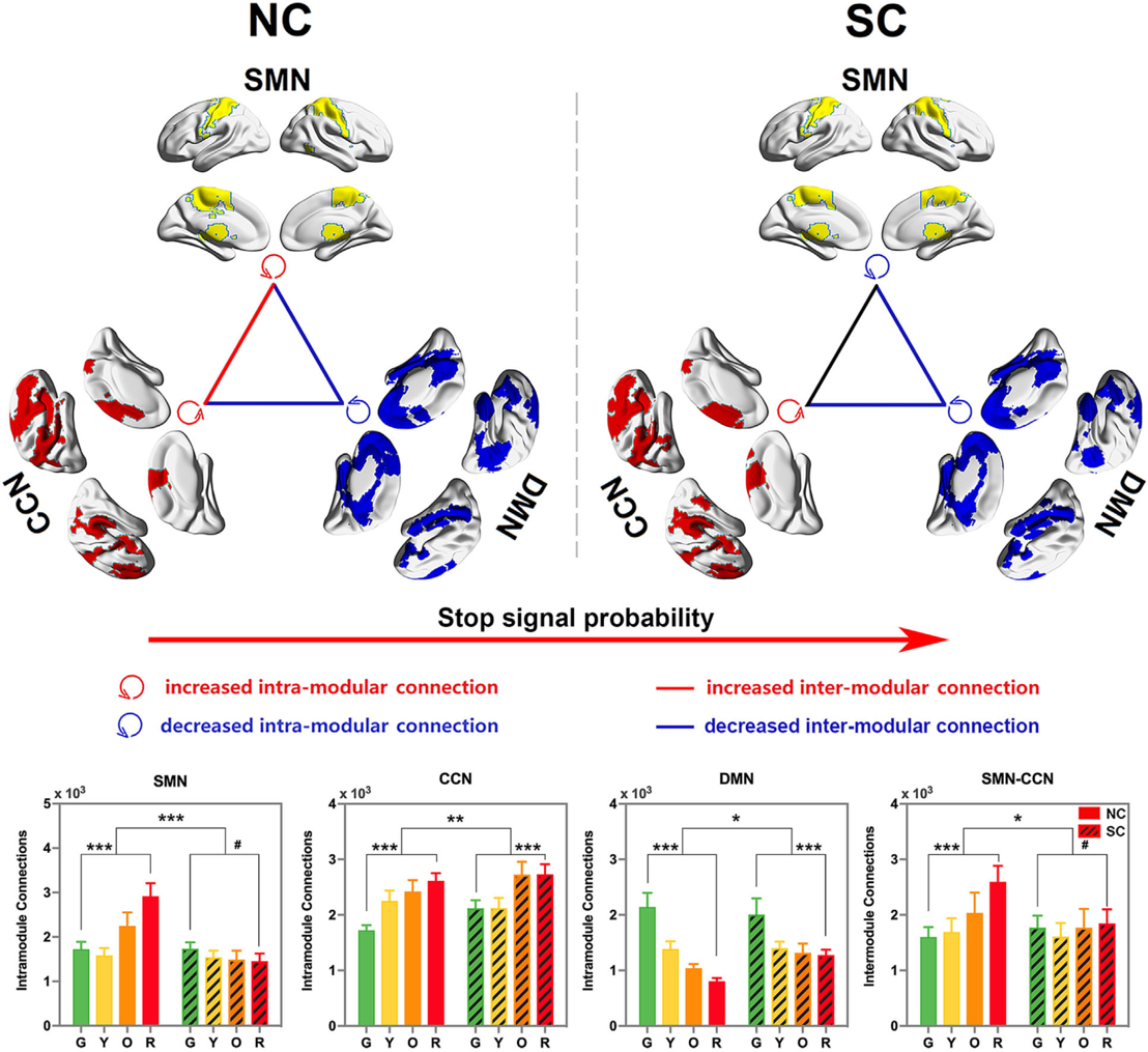 研究发现了三个稳定的网络模块:感觉运动网络(SMN)、认知控制网络(CCN)和默认模式网络(DMN),参与到主动抑制到动态加工过程(图1D)。随着主动抑制负荷增加,SMN、CCN内部和SMN-CCN之间的功能连接增强,DMN内部和SMN-DMN、CCN-DMN之间的功能连接减弱;同时,突显香烟线索会干扰主动抑制相关网络模块的有效动态交互作用(图2)。此外,在节点区域水平,发现负责主动抑制加工的关键节点-右侧额上回、眶额回、中央前/后回以及双侧基底节等区域的活动,受到突显香烟线索与抑制负荷的调节。