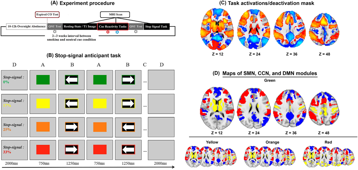 研究招募了26名正常健康的右利手的吸烟者,烟龄均在两年以上,且日吸烟量大于10支。所有被试需要完成两次线索反应任务与停止信号预期任务的功能磁共振扫描,分别是在中性线索环境和吸烟线索环境下完成(见图1A)。研究基于图论的模块分析,识别提取了个体完成停止信号预期任务过程中,与主动抑制相关网络的模块化结构(图1D),并进一步研究不同主动抑制负荷和突显香烟线索是如何调节这些模块内/间的相互交互作用。