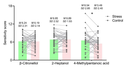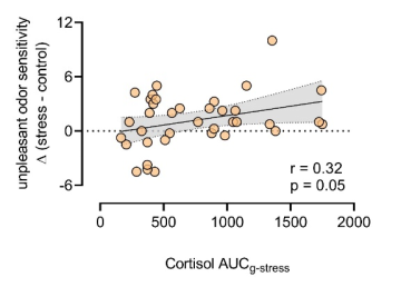 研究采用被试内设计,招募令40名健康成年被试进行了急性应激影响不同效价气味(愉悦: β-香茅醇; 不愉悦: 4-甲基戊酸;中性: 2-庚醇)嗅知觉的心理物理学实验。结果发现:与对照条件相比,应激后被试对不愉悦气味的敏感性显著增加(p = 0.02),对愉悦和中性气味的敏感性无显著变化(图1)。应激相关的唾液皮质醇反应与不愉悦气味敏感性增加有关(r = 0.32, p = 0.05)(图2)。此外,在阈上水平,应激后被试对愉悦气味的主观愉悦度评价显著降低(p = 0.003)。