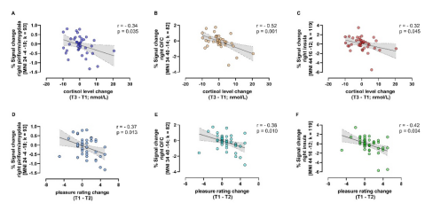 图4 右侧梨状皮层 / 杏仁核、右侧 OFC 和右侧岛叶对愉悦气味的激活水平与唾液皮质醇变化(A-C)或主观愉悦感变化(D-F)相关。
