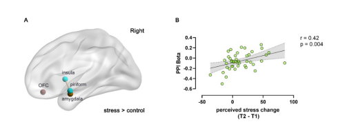 图5 A.应激后右侧梨状皮层和右侧岛叶之间的功能连接强度增加。B. 在愉悦气味条件下,右侧梨状皮层和右侧脑岛间的功能连接水平与应激后的压力感变化相关。