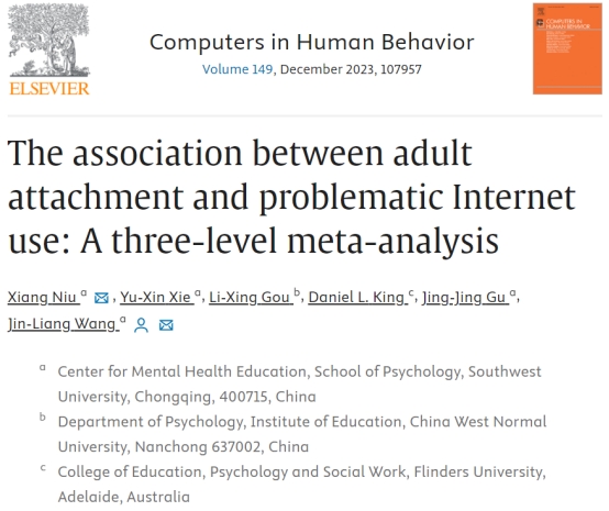 Niu, X., Xie, Y. X., Gou, L. X., King, D. L., Gu, J. J., & Wang, J. L. (2023). The association between adult attachment and problematic Internet use: A three-level meta-analysis. Computers in Human Behavior, 149, 107957. https://doi.org/10.1016/j.chb.2023.107957