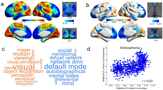 图2.(a-b)分裂样特质关联的局部层级脑网络特征;(c)显著的脑区主要分布在负责初级感知觉信息加工网络和抽象信息处理的默认网络;(d)分裂样特质关联的层级脑网络图谱与我们之前在精神分裂症中报告的图谱呈现中等程度相关。