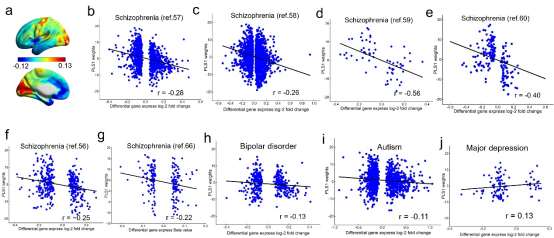 图3.(a-j)分裂样特质关联的层级脑网络模式基因富集的结果与前人报告的精神分裂症GWAS分析结果关联最为紧密。