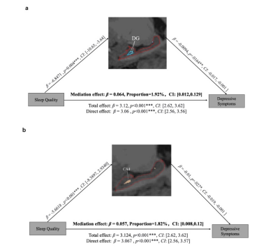 图2. 上图:海马亚区DG体积被发现在睡眠质量与自评抑郁症状之间起到中介作用。下图:海马亚区CA-4体积也被发现在睡眠质量与自评抑郁症状之间起到中介作用