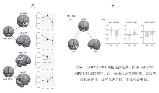 参与者来自中国人人格特质的多模态神经影像项目。根据DSM-5的筛选标准,严重贪食组21人(Severe bulimic symptoms, SB)、轻微贪食组114人(Mild bulimic symptoms, MB)和健康对照组91人(Healthy controls, HC)。首先,使用广义线性模型测量三组在内外侧眶额叶功能连接的差异。随后,进一步使用频谱动态因果模型分析有连接方向的差异。研究发现,严重贪食组和轻微贪食组有共同的神经基础,即外侧眶额叶与顶上小叶之间功能连接更弱,支持贪食症状中抑制控制功能降低的作用。而相比严重贪食组,轻微贪食组表现出外侧眶额叶与枕极功能连接强度更强,可能说明抑制控制与初级视觉加工回路可以作为区分贪食症状严重程度变化的神经标记物。相比健康对照,在轻微贪食组观察到内侧眶额叶到杏仁核和外侧眶额叶之间更弱的有向连接,进一步阐明轻微贪食个体食物奖赏加工回路内,及其与抑制控制回路间的异常相互作用。