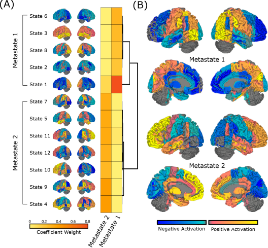 图1:通过HMM分解大脑静息状态下的状态及其元状态。(A) 由HMM推断出的12个大脑状态及其元状态。(B) 两个元状态的大脑激活图。