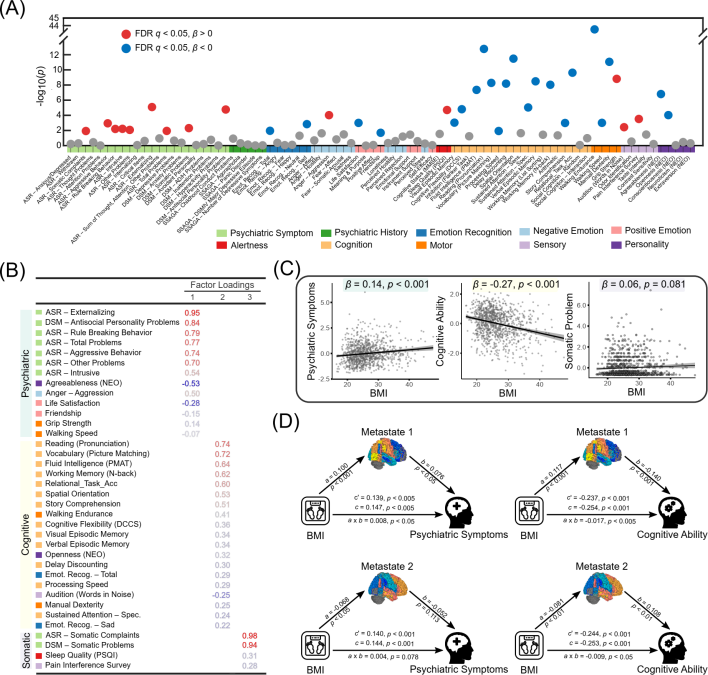 图2:HCP数据集中,BMI、大脑元状态占比和多种心理行为变量之间的关联。 (A) BMI与多种行为测量之间的相关性; (B) 关键行为指标的因子分析; (C) BMI与降维后因子得分之间的相关性; (D) 大脑元状态占比在BMI与认知能力和精神症状间关系中的中介作用。