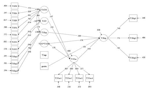 注:CM = 儿童期虐待,PN = 身体忽视,EA = 情感虐待,EN = 情感忽视,PA = 身体虐待,SA = 性虐待,Exp = 探索性行为,IU = 不确定性不容忍,Unc = 不确定性压力;图中所有系数都是标准化且显著的.