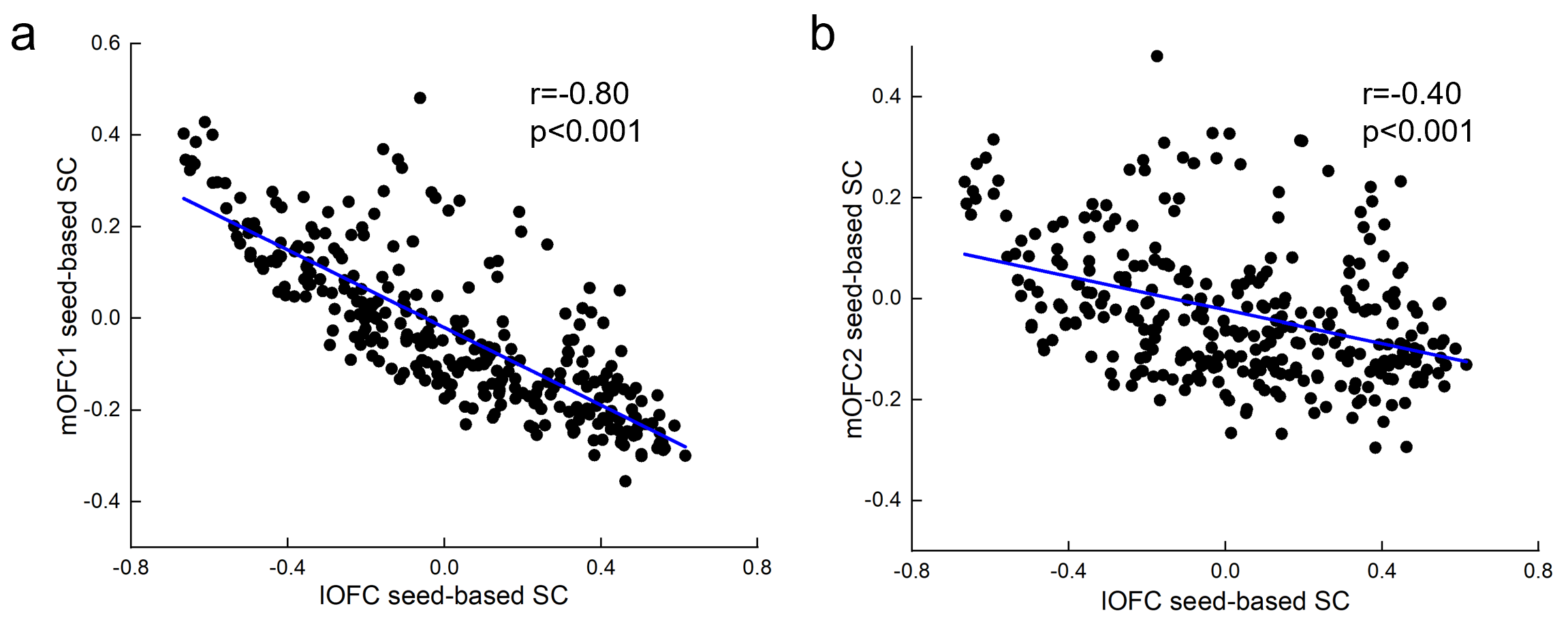 图2、BMI与外侧眶额叶皮层结构相似性成负相关,表现为去耦合减弱;BMI与内侧眶额叶皮层结构相似性成正相关,表现为去分化减弱