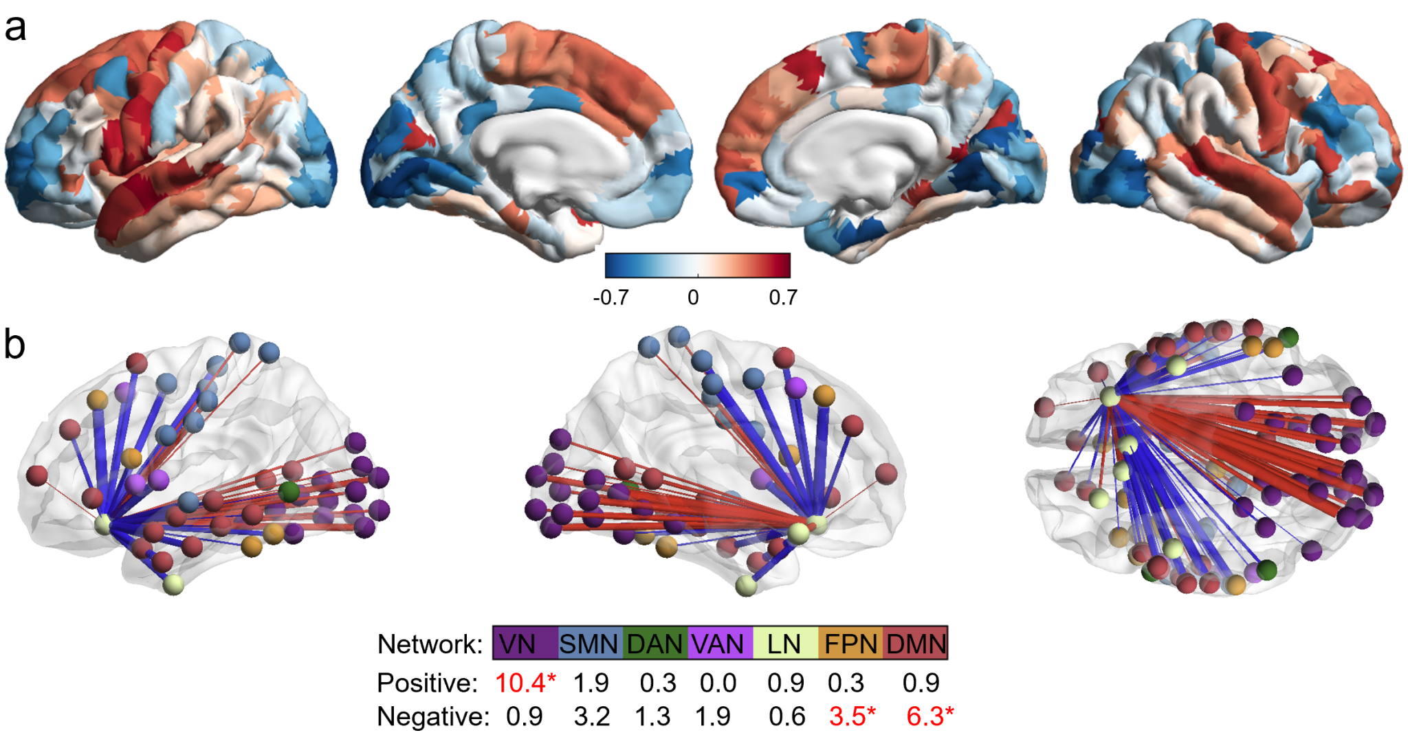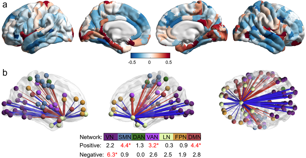 图3、外侧眶额叶皮层结构相似性去耦合减弱表现为主要表现为其与认知系统(默认模式网络和额顶网络)的失耦合,同时与视觉系统去分化减弱