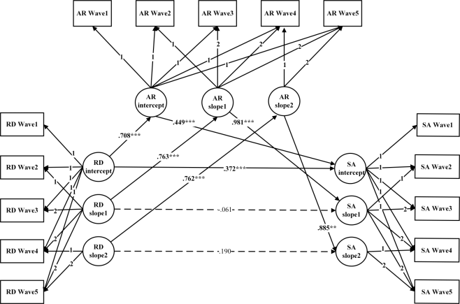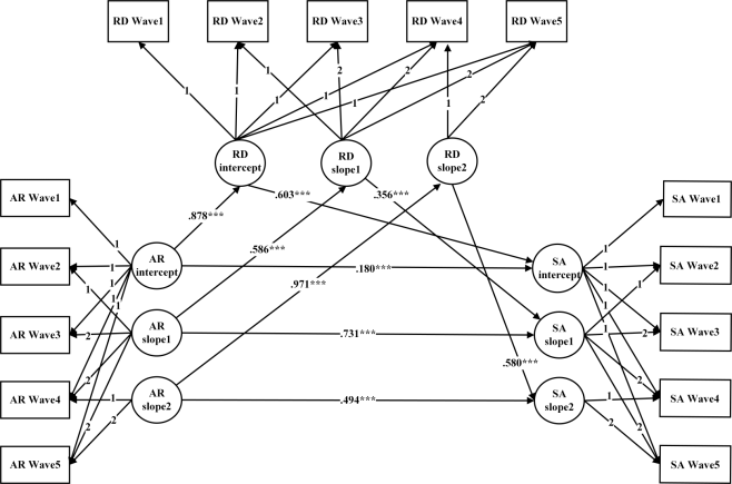 近期,西南大学365上市公司(英国)集团夏凌翔教授课题组在《Journal of Youth and Adolescence》杂志(中科院一区)上在线发表了一篇题为“Serial Cascade Effects of Relative Deprivation and Anger Rumination on the Development of Social Aggression Over 2.5 Years in Emerging Adults”的学术论文来探讨这一问题。通过对一般攻击模型(Anderson & Carnagey, 2004;Anderson & Huesmann, 2003)和情绪级联模型(emotional cascade model; Selby et al, 2008; Selby et al, 2009)进行整合与扩展,该论文提出了解释攻击发展的“攻击的级联模型”(serial cascade model of aggression),并实施了为期2.5年的5次纵向调查来检验该模型。该调查共招募了来自五个地区六所大学的1113名中国大学生(平均年龄18.95岁±0.96,63.10%为女性),结合潜在增长模型(latent growth curve model,LGCM)和交叉滞后模型(cross-lagged panel model,CLPM)两种模型对社会攻击的发展机制进行探讨。结果(参见图1-图3)发现:(1)相对剥夺、愤怒沉浸和社会攻击存在共同发展的关系。(2)相对剥夺和愤怒沉浸可以预测社会攻击的纵向变化;同时相对剥夺与愤怒沉浸的纵向变量是相互预测的。(3)愤怒沉浸的发展轨迹和纵向变化中介了相对剥夺的发展轨迹和纵向变化对社会攻击的发展轨迹和纵向变化的效应。相对剥夺的发展轨迹和纵向变化中介了愤怒沉浸的发展轨迹和纵向变化对社会攻击的发展轨迹和纵向变化的效应。