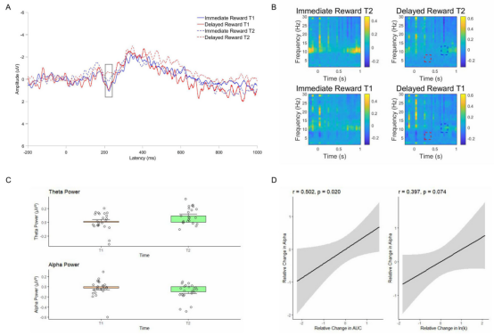 接着,研究分析了决策过程中事件相关电位(ERP)的变化,并结合HD-tDCS刺激后的时频分析进行探索。F4阳极刺激引起的ERP幅值变化如图1A所示,即刺激后延迟奖励条件下F4通道的P2成分的振幅显著降低,这可能表明个体在该条件下对延迟奖励的注意力资源分配减少,从而降低了其对延迟奖励的偏好。对F4电极通道进行时频分析(图1B)时发现,在延迟奖励选择条件下,θ频段功率(4~8Hz)在250ms至400ms显著增加,而α频段功率(8~13Hz)在650ms至800ms显著降低,具体差异如图1C所示。此外,如图1D所示,行为和大脑活动之间的相关性分析揭示了脑电功率变化与行为变化的关系。结果显示,α频段功率的相对变化与AUC的相对变化之间存在显著的正相关关系。