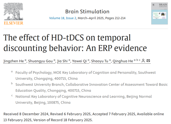 论文信息:He, J., Gou, S., Shi, J., Qi, Y., Tu, S., He, Q.* (2025). The effect of HD-tDCS on temporal discounting behavior: An ERP evidence. Brain Stimulation, 18(2): 212-214.