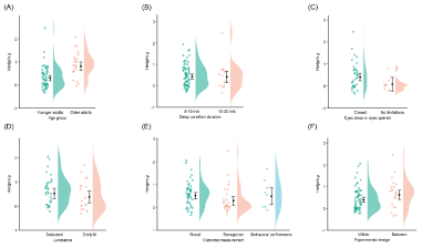 图1. 调节分析讨论多个因素对记忆巩固的影响。(A)年龄;(B)持续时间;(C)睁闭眼;(D)环境明暗;(E)记忆测量方式;(F)实验设计