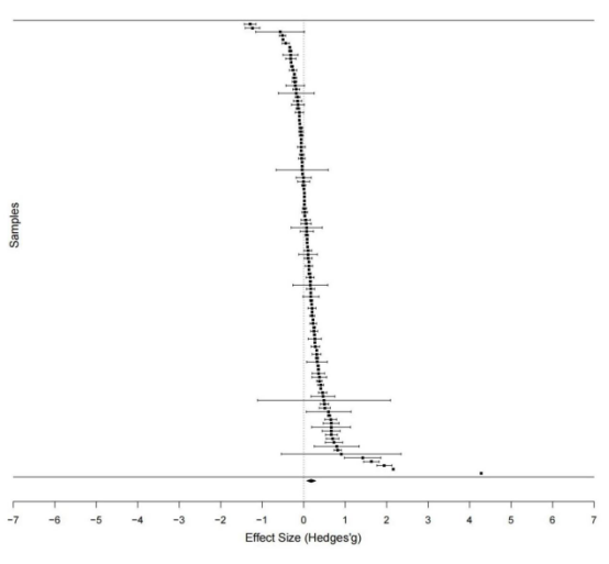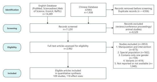 为了进一步厘清延迟折扣中的性别差异,并检验其中可能的调节因素,研究团队汇集了1995年到2023年共109项独立研究,包含118个效应量,涉及16个国家(或地区)共6万余名被试(图2)。该项研究除了把基于标准化均值差计算的Hedge’s g作为效应量指标外,还编码了一系列人口学变量(年龄、地区、受教育年限、社会经济地位)、方法学变量(延迟折扣模型、延迟时间、奖赏机制、奖赏大小),以检验这些变量可能的调节效应。