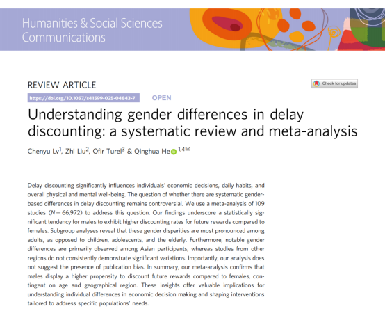 Lv, C., Liu, Z., Turel, O., & He, Q. (2025). Understanding gender differences in delay discounting: A systematic review and meta-analysis. Humanities & Social Sciences Communications, 12, 589.