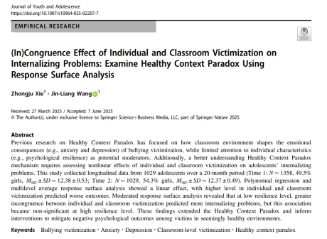Xie, Z, & Wang, J. (2025). (In)Congruence Effect of Individual and Classroom Victimization on Internalizing Problems: Examine Healthy Context Paradox Using Response Surface Analysis. Journal of Youth and Adolescence. Advanced online publication.