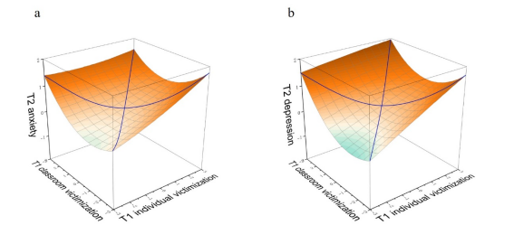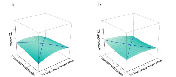图1 低心理韧性水平下的响应曲面:个体受害和班级受害对焦虑(a)/抑郁(b)的不一致性效应