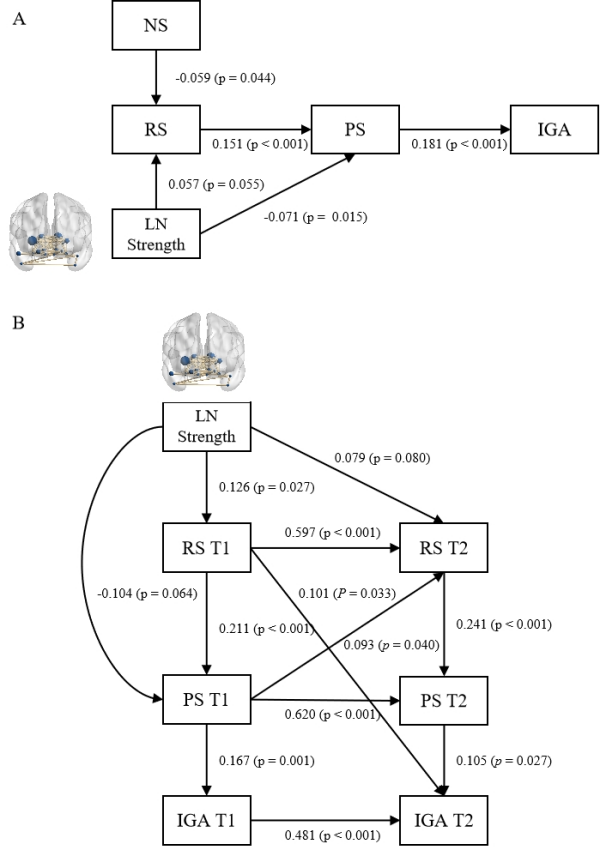 纵向分析显示,风险决策能力的变化能够预测奖赏敏感性的动态变化,奖赏和惩罚敏感性则共同驱动IGA倾向的发展,而边缘网络功能连接通过影响奖赏和惩罚敏感性,间接影响IGA倾向(图3)。