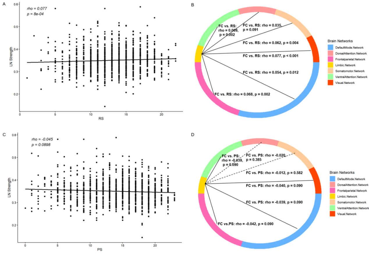 该研究基于1142名大学生的大样本横断面数据及303名参与者的纵向随访数据,结合行为测量与静息态功能磁共振成像,系统探讨了奖赏敏感性、惩罚敏感性、风险决策与IGA倾向之间的动态关系及其神经基础。研究发现,边缘网络的功能连接强度与奖赏敏感性呈正相关,与惩罚敏感性则呈负相关趋势,而且边缘网络跨网络的功能连接也与奖赏敏感性显著相关(图2)。