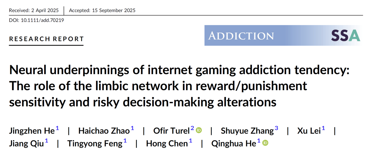 论文信息:He J, Zhao H, Turel O, Zhang S, Lei X, Qiu J, Feng T, Chen H, He Q. (2025). Neural underpinnings of internet gaming addiction tendency: The role of the limbic network in reward/punishment sensitivity and risky decision-making alterations. Addiction