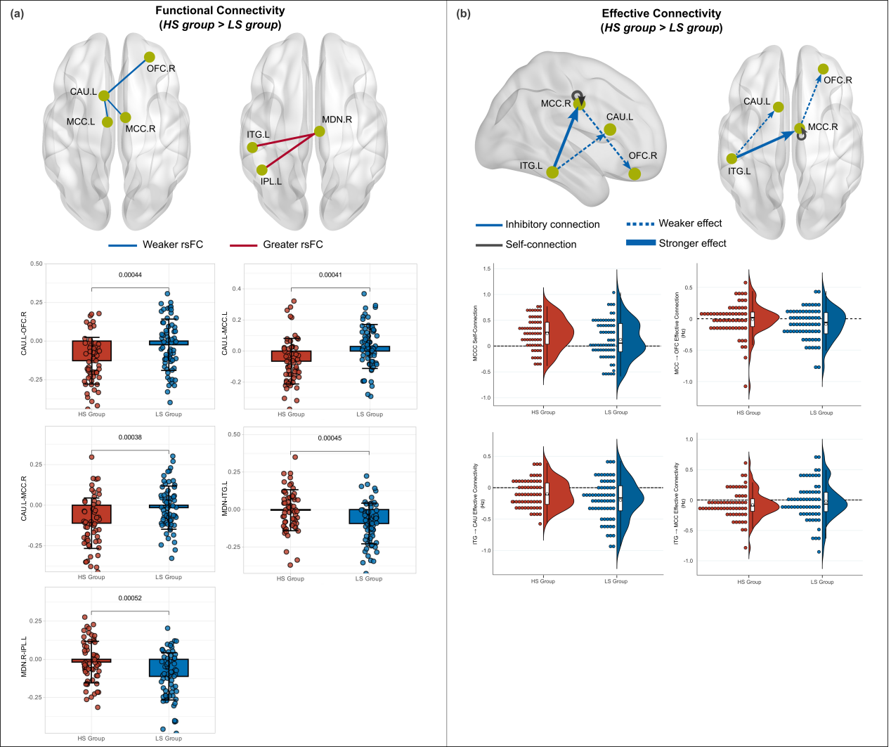 本研究系统揭示了高分裂型个体静息状态下的功能连接和有效连接神经机制。研究发现,与低分裂型个体相比,高分裂型个体尾状核与前眶额叶皮质之间的功能连接更弱,中背侧丘脑与颞下回之间的功能连接更强(图1a)。频谱动态因果模型发现从颞下回到尾状核,以及从颞下回经过中扣带回皮层到前眶额叶皮质的抑制性有效连接减弱。中介分析(图2b)发现了惩罚敏感性在功能连接与分裂型人格之间的关键中介作用,揭示了神经连接、认知与特质之间的潜在通路。